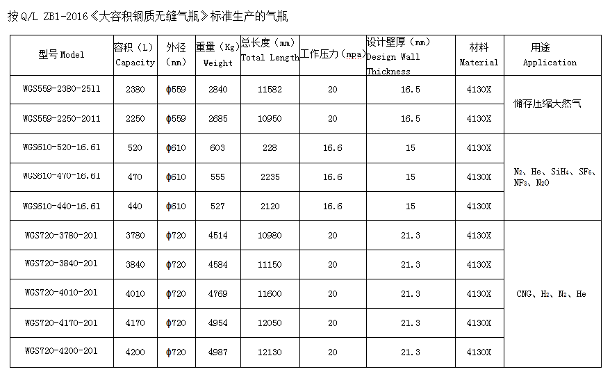 大容積鋼質無縫氣瓶主要用於CNG(壓縮天然氣)的運輸,由4130X無縫鋼管制成,可盛裝20MPa或25MPa的天然氣。公司按照權威的美國标準和相關國際标準,制定瞭企業标準Q/LZB1-2016《大容積鋼質無縫氣瓶》,對該類産品的設計、制造、檢驗、驗收做出瞭嚴格規定